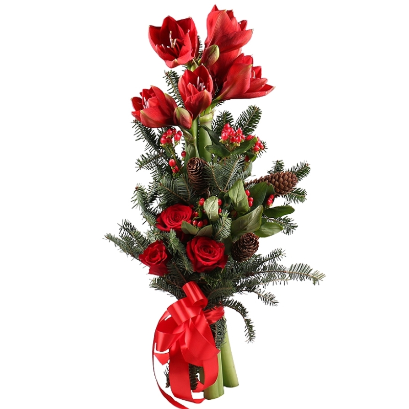 Букет состоит из 3 амариллиса, 3 розы, 1 ветка гиперикума, ель, шишки, прозрачная упаковка, атласная лента.