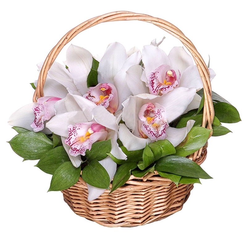 Букет состоит из 7 орхидей, зелень, корзина, оазис.