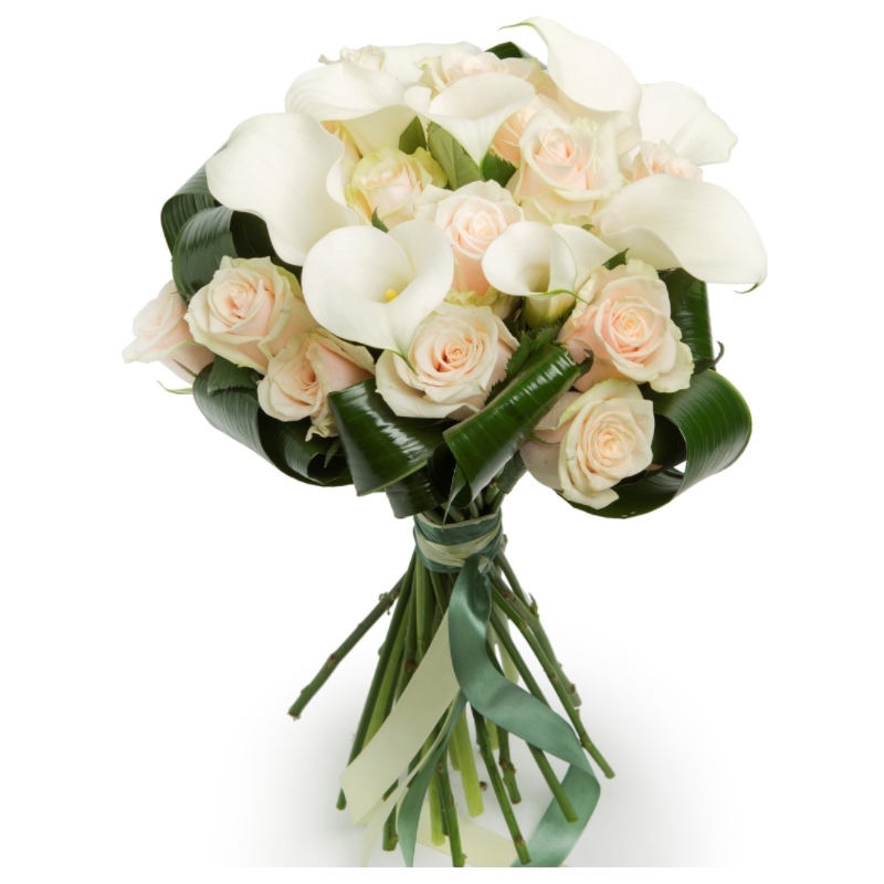 Букет состоит из 16 кремовых роз, 9 белых калл, аспидистра, прозрачная упаковка, атласная лента.