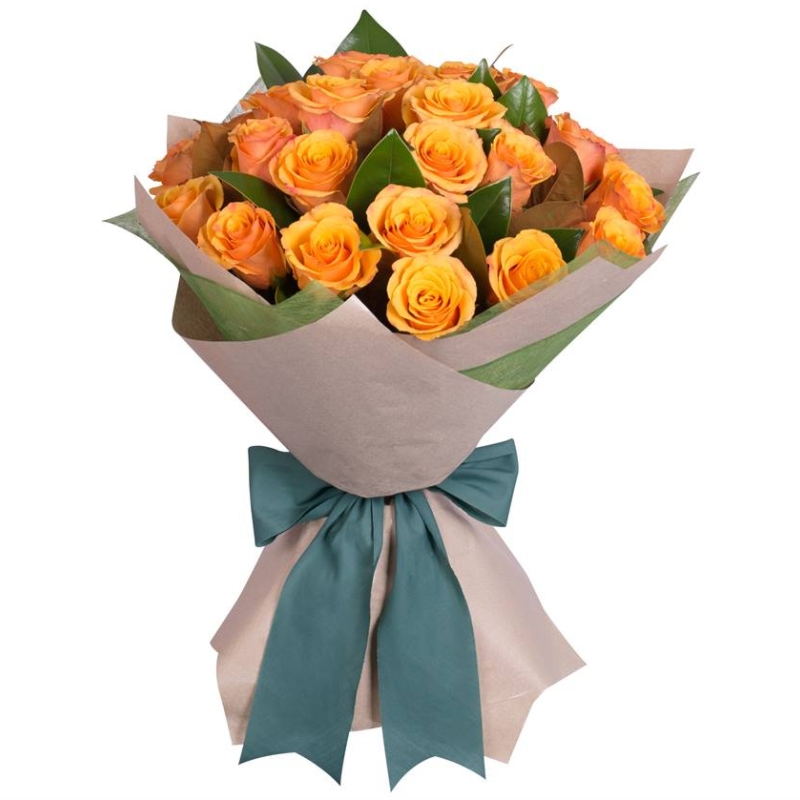 Букет состоит из 25 оранжевых роз, красивая упаковка, атласная лента.